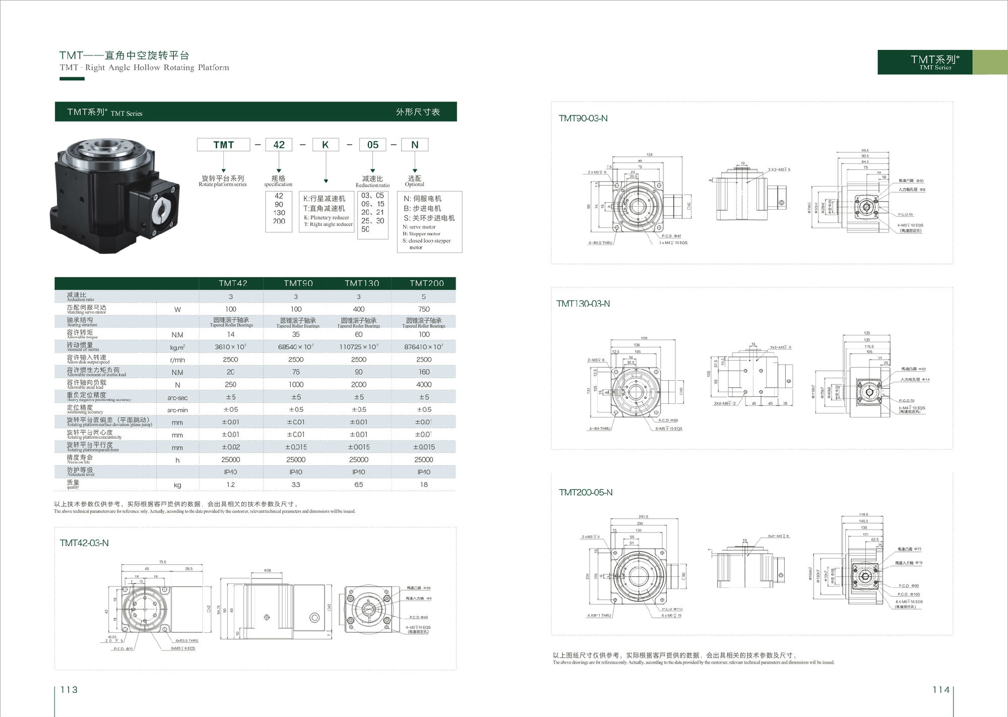 TMT中空旋轉平臺傳動齒輪經過研磨處理,使用高精度齒輪結構和徑向軸承,方便設計,可任意搭配大部分品牌的伺服馬達。