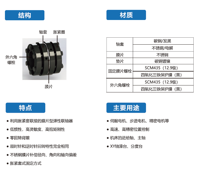 HDFPS-T系列聯軸器采用碳鋼發黑,利用脹緊套聯接的膜片型彈性聯軸器,廣泛用于伺服電機、步進電機、精密電機等。