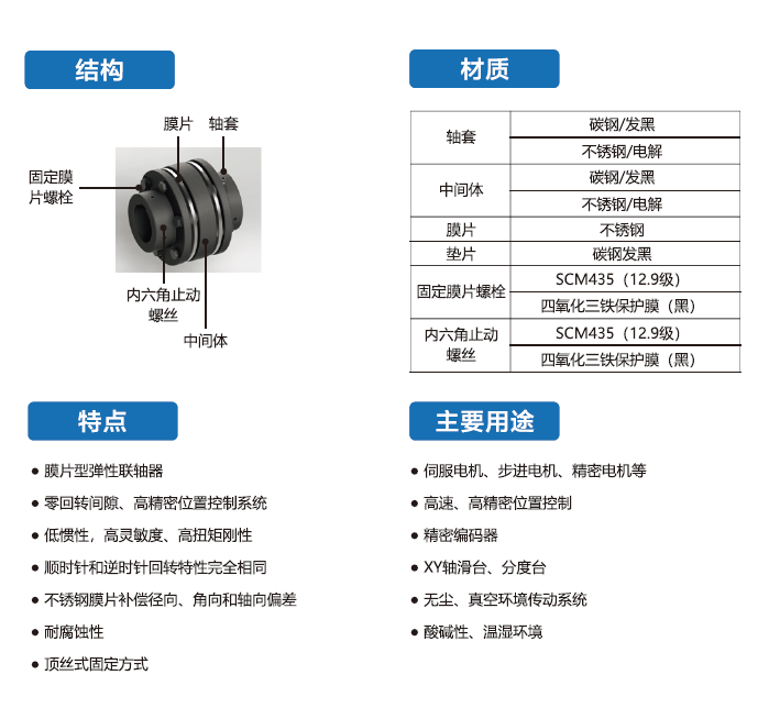 HSJP-G系列聯軸器采用碳鋼發黑,利用脹緊套聯接的膜片型彈性聯軸器,廣泛用于伺服電機、步進電機、精密電機等。