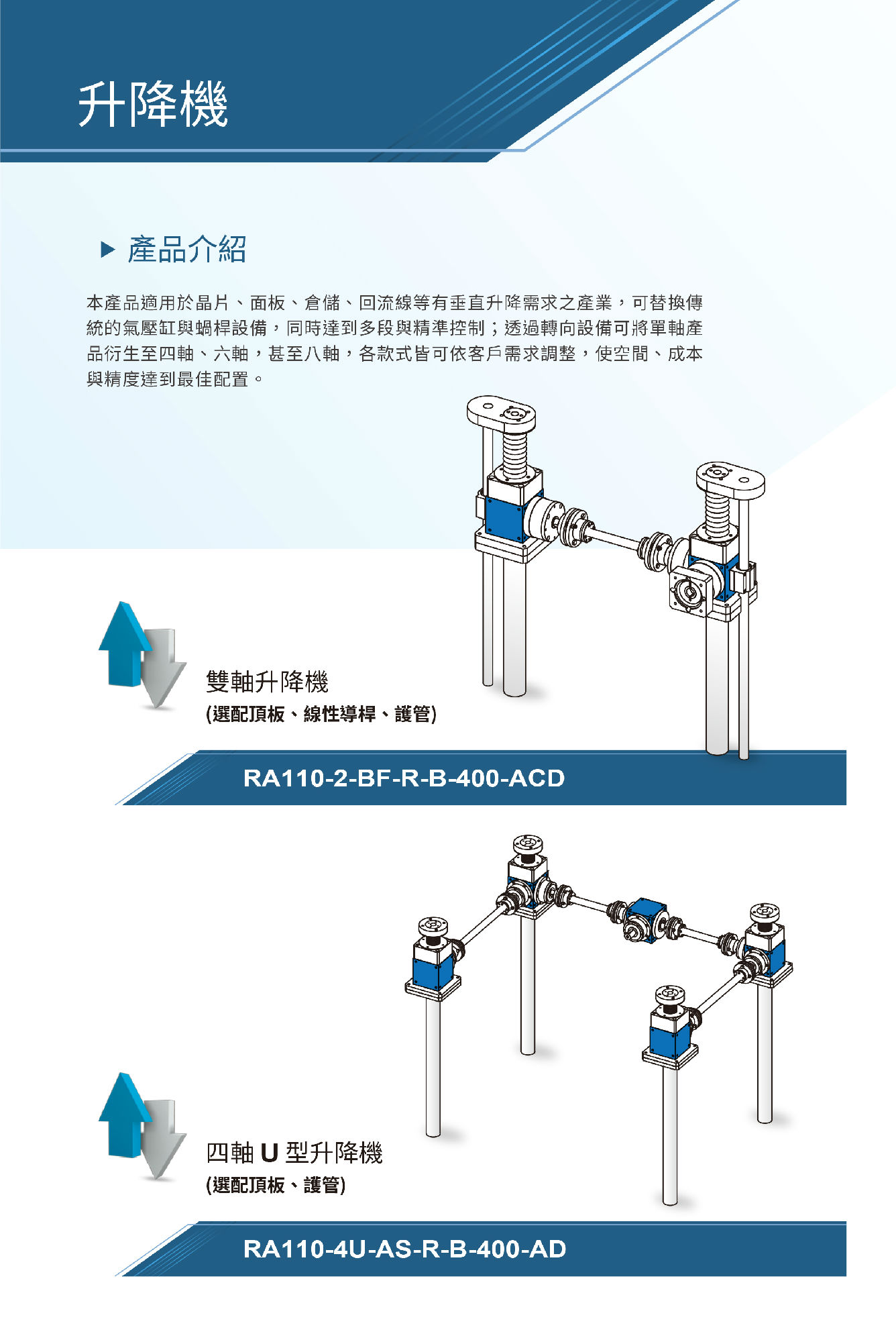 2BF系列雙軸升降機(jī)可選配頂板。適用于晶片、面板、倉(cāng)儲(chǔ)、回流線等有垂直升降需求的產(chǎn)業(yè),可替換傳統(tǒng)的氣壓罐與蝸桿設(shè)備,同時(shí)達(dá)到多段與精準(zhǔn)控制。