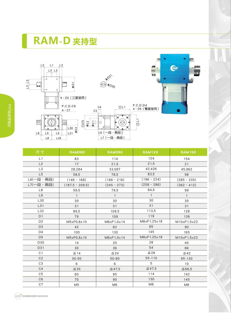 RAM-D系列是夾持型設計。 鋁合金材質可提高散熱能力,減緩溫升現象造成影響。 多樣化的出力軸可因應各種場合,客制化的入力端可搭配各式馬達。 提供各式特色之減速機,供使用者依需求選購。 特殊油封設計,正常使用下不需保養亦不用更換潤滑油,可延長使用壽命。 各式特色,體積小,省空間,噪音低,輸出扭矩高,安裝容易,可搭配馬達型號廣泛。 RAM搭配DM,一體成型的齒輪組,可有效的減低噪音。 RAM搭配DH,最佳的性價比,可廣泛應用于各種場合。