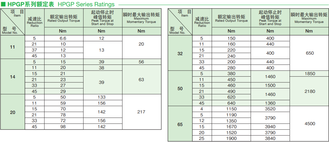 在行星齒輪減速機中追加轉矩提升的HPGP系列,高精度行星齒輪減速機,可簡單的安裝到各公司的伺服電機上。 諧波發生器:橢圓形凸輪的外圈上嵌入薄型的滾珠軸承,整體呈一橢圓形狀的零件。軸承的內圈固定于凸輪之上,外圈則介由滾珠彈性變形。一般安裝在輸入軸上。 柔輪:具有薄壁杯型的金屬彈性體的零件。杯的開口部外圈刻有齒形。柔輪的底部稱為膜,通常安裝到輸出軸上。 剛輪:剛性環狀的零件。內側上刻有與柔輪同樣大小的齒形,且比柔輪多2個齒數。一般固定在外殼上。