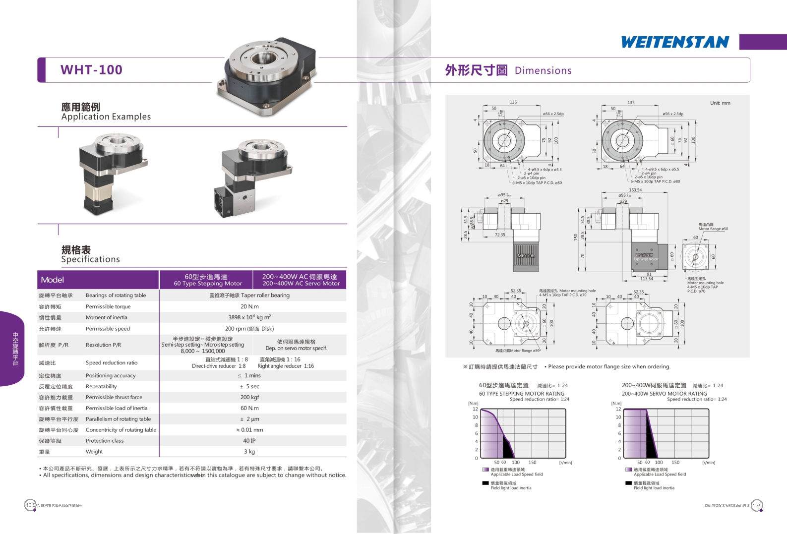 WHT系列中空旋轉平臺。 具有優異定位精度與重復精度的中空旋轉平臺,可搭配使用伺服馬達或步進馬達,展現獨特的性能可靠度。 工作物可直接鎖固。旋轉盤面可直接鎖固工作物,提升工件裝載之方便性。 配線方便。此旋轉平臺為中空式設計,無論是配線或配管均方便。 高精度。定位精度小于1分。重復精度可達±5秒。 運轉動作平穩。盤面轉動平穩,順暢,且定位快速。 適用各種馬達。中空旋轉平臺可采用各種廠牌之伺服馬達或步進馬達驅動。