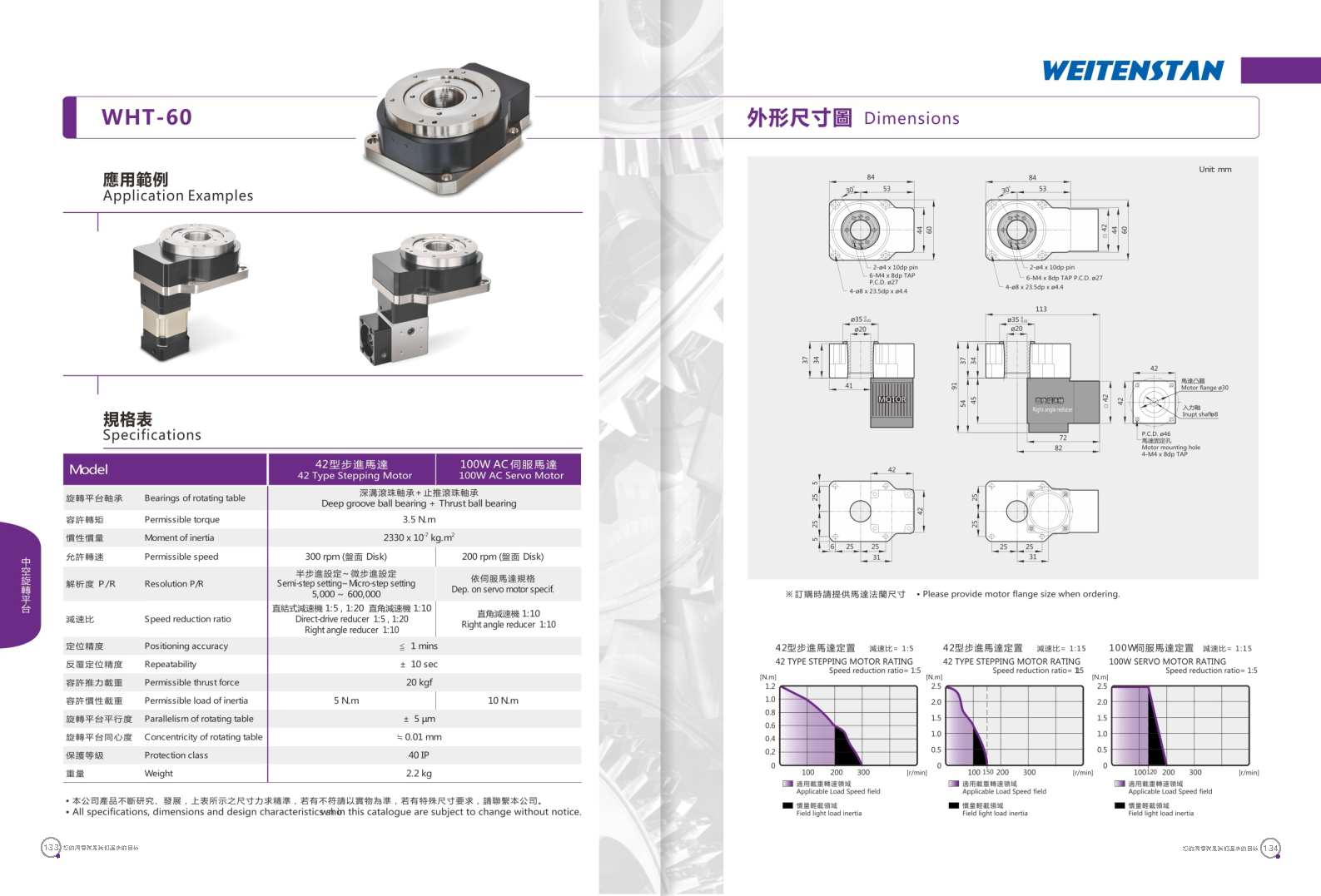 WHT系列中空旋轉平臺。 具有優異定位精度與重復精度的中空旋轉平臺,可搭配使用伺服馬達或步進馬達,展現獨特的性能可靠度。 工作物可直接鎖固。旋轉盤面可直接鎖固工作物,提升工件裝載之方便性。 配線方便。此旋轉平臺為中空式設計,無論是配線或配管均方便。 高精度。定位精度小于1分。重復精度可達±5秒。 運轉動作平穩。盤面轉動平穩,順暢,且定位快速。 適用各種馬達。中空旋轉平臺可采用各種廠牌之伺服馬達或步進馬達驅動。